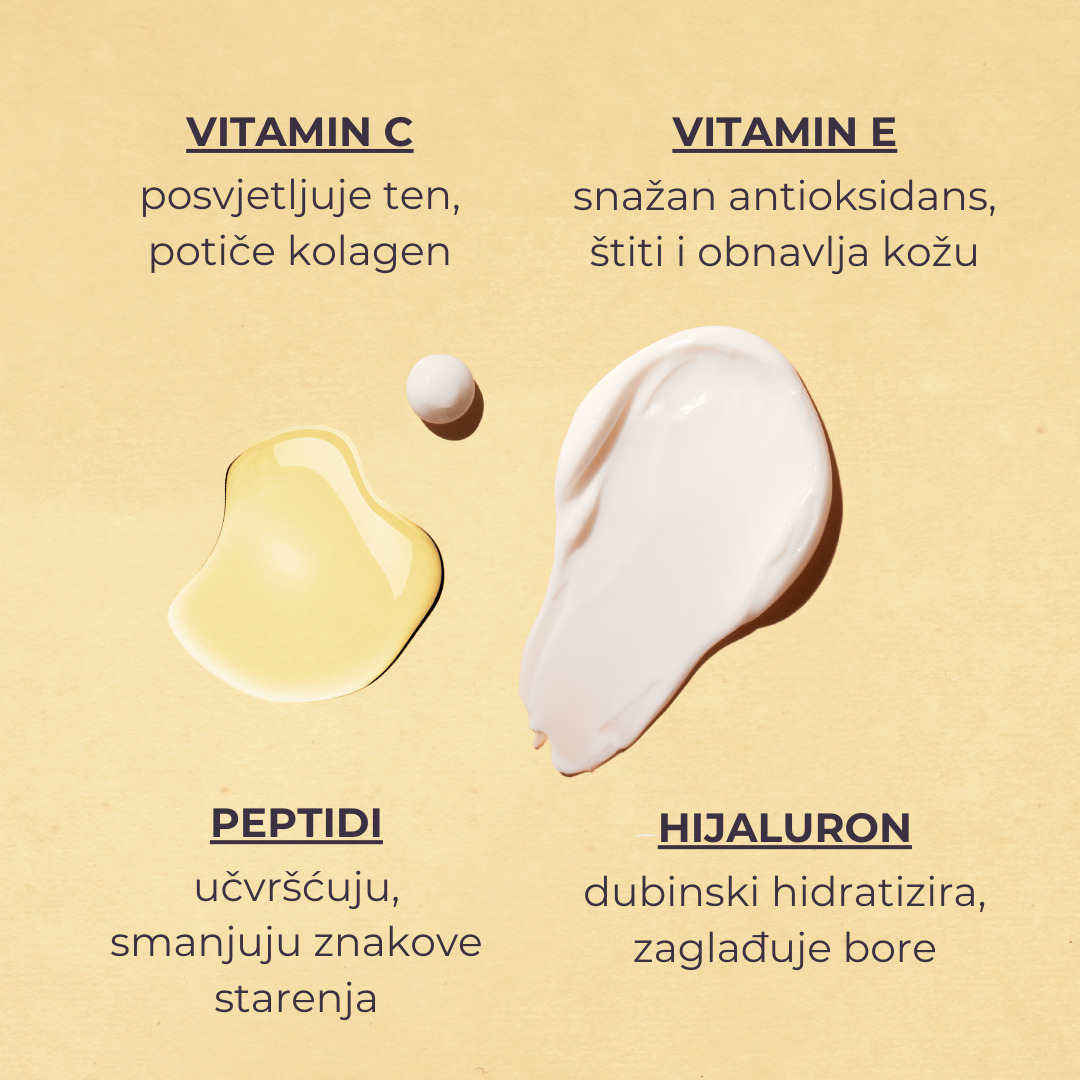 Vitamin C posvjetljuje hiperpigmentacije i potiče proizvodnju kolagena, dok peptidi zaglađuju bore i poboljšavaju elastičnost kože. Koža postaje čvršća, blistavija i hidratizirana, bez sivila i umornog izgleda.