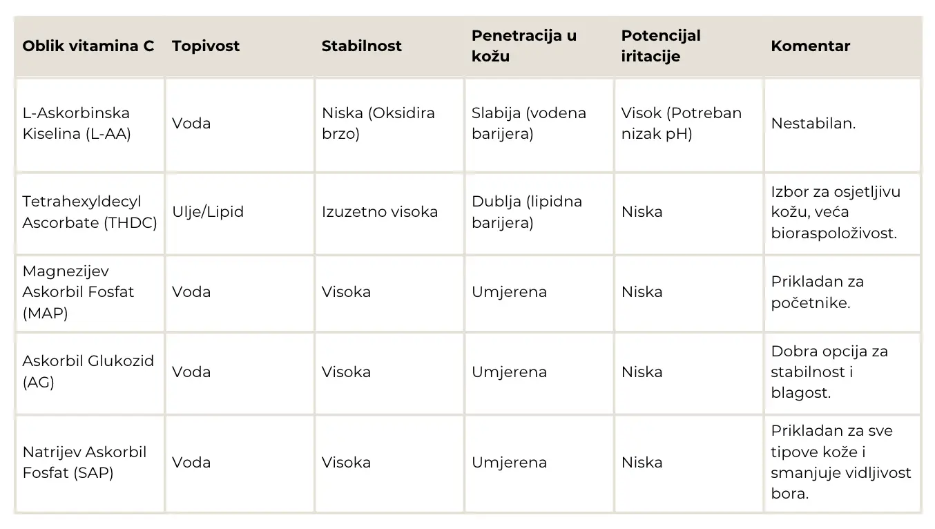 Za osjetljivu kožu, ili ako je cilj dugotrajno održavanje sjaja uz minimalnu iritaciju, odaberite stabilne derivate poput Tetrahexyldecyl Ascorbate (THDC), Askorbil Glukozida (AG) ili Natrijevog Askorbil Fosfata (SAP).